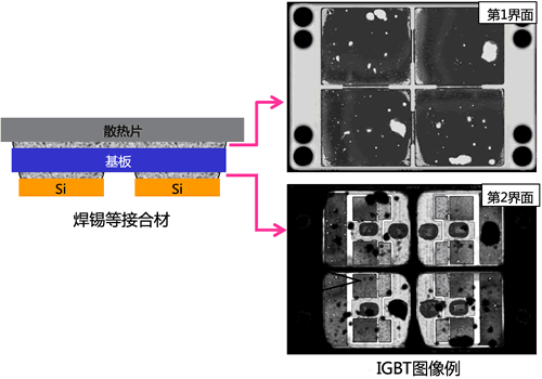 适用于以IGBT为代表的各种零部件的接合部分的在线检查。无论大小,灰色区域内的白点、区域全部是剥离、孔隙。