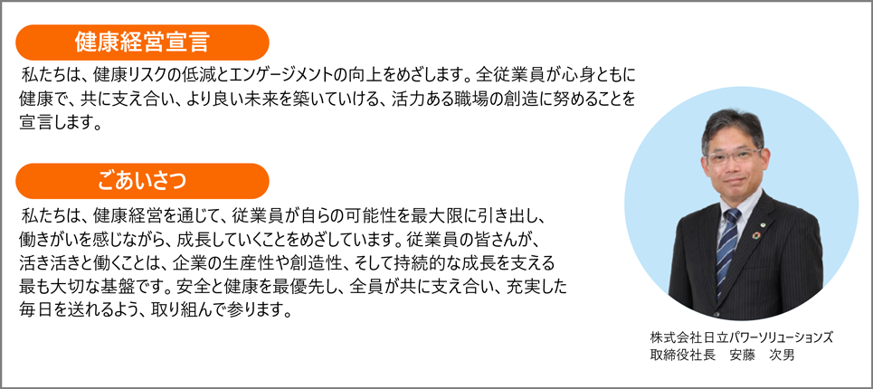 「心身ともに健康であり続けること」は私たちの生活の基盤であり、めざすべき普遍的な目標です。当社では、従業員の健康増進は、事業成長に不可欠な経営課題と捉えて、「安全と健康を守ることは全てに優先する」を基本理念に掲げて、従業員とそのご家族が健康で心豊かな生活を送ること、充実感を持って働いていただけることを目的にさまざまな活動を推進しています。当社はこの健康経営の取り組みが礎となり、個人と組織の継続的な成長と発展につながっていくと考えています。