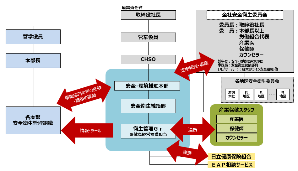 健康経営推進の最高責任者である取締役社長をトップに健康経営推進担当者が中心となって産業保健スタッフや健康保険組合と連携しながら、健康経営を推進しています。