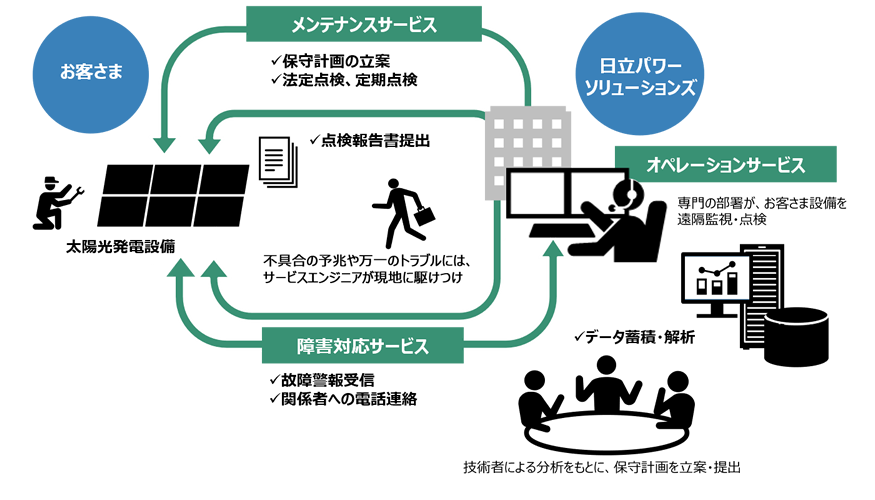 稼働監視や運転実績の管理などの運転支援業務を行っています。また、発電所で障害が発生した場合には、24時間365日稼働している当社の遠隔監視・支援センタで障害情報を受け付けます。 受け付けた警報は、当社担当部署に連絡され、緊急出動などの対応を取ることで、ダウンタイムの短縮化に貢献します。 ソーラーパネル、受変電設備、パワーコンディショナ、空調機、集電箱、接続箱、気象計器、パワーコンディショナ収納パッケージなどの 太陽光発電設備は、複数のメーカーの装置で構成されているため、当社がまとめて窓口となることで、お客さまの負担を軽減します。